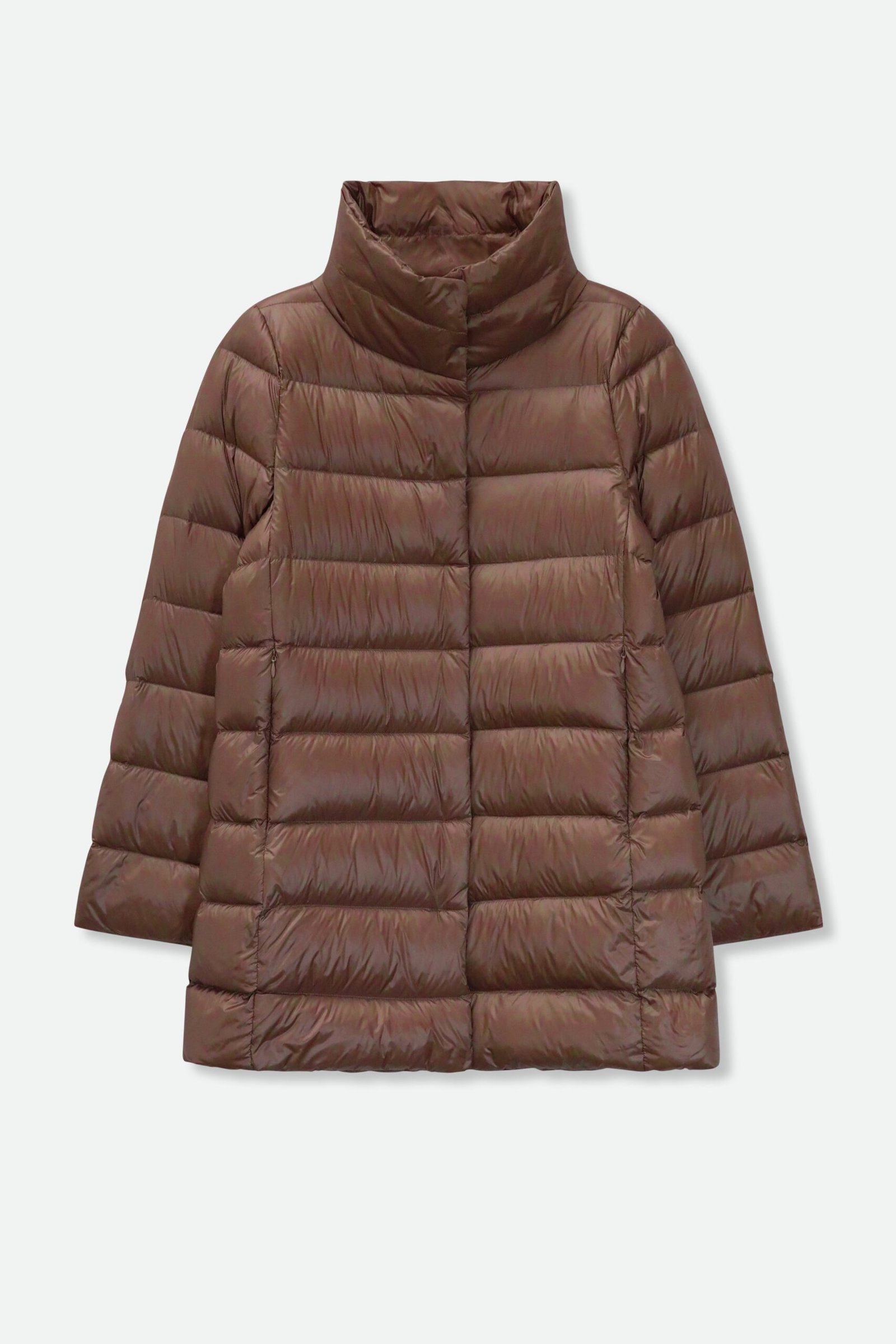 The luxe. soft. and lightweight goose down Celerina jacket is your A-line coat ready to hit the town. This coat was designed for layering as a chic piece of indoor and outdoor wear. It features a past-the-hip length. long tapered sleeves. side pockets. a cozy high funnel neck. and a front-snap closure.